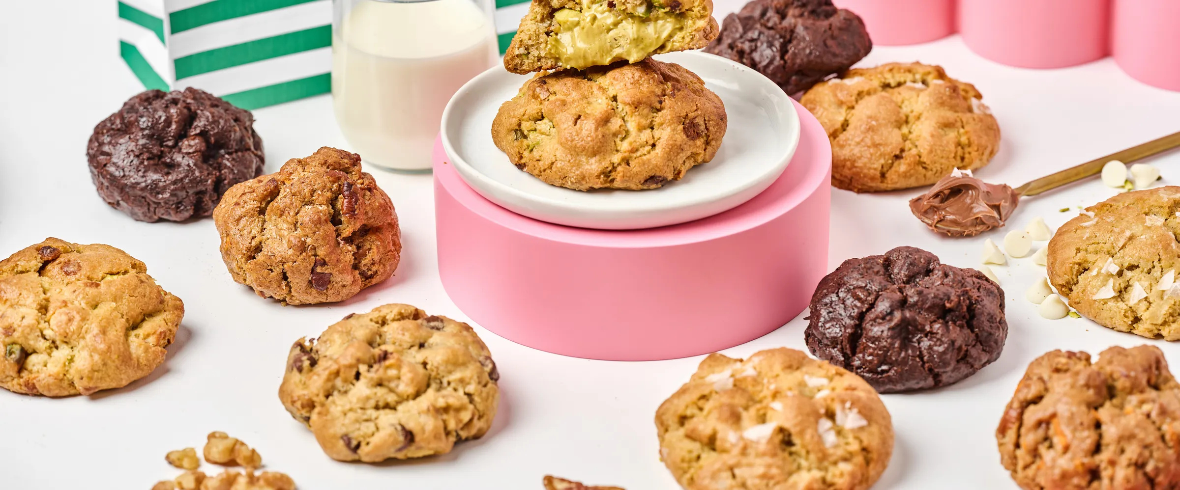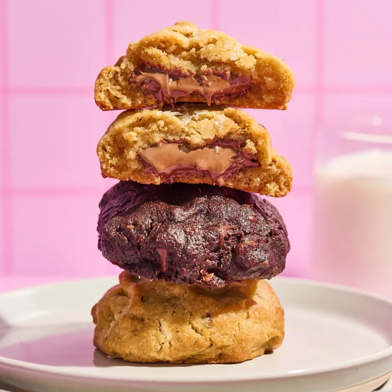 Galleta de masa de chocolate con relleno de kataifi crujiente y crema de pistacho.